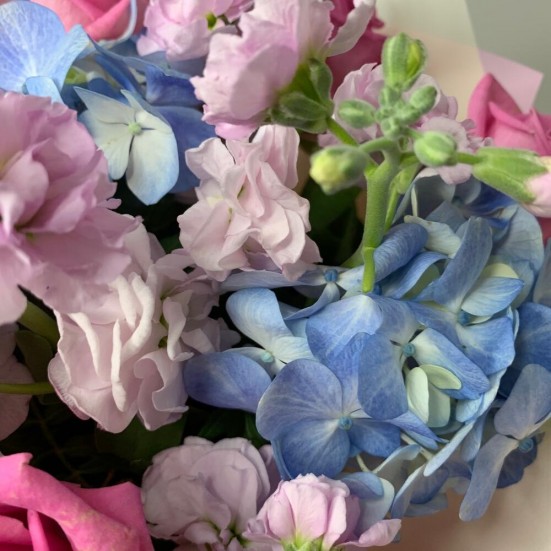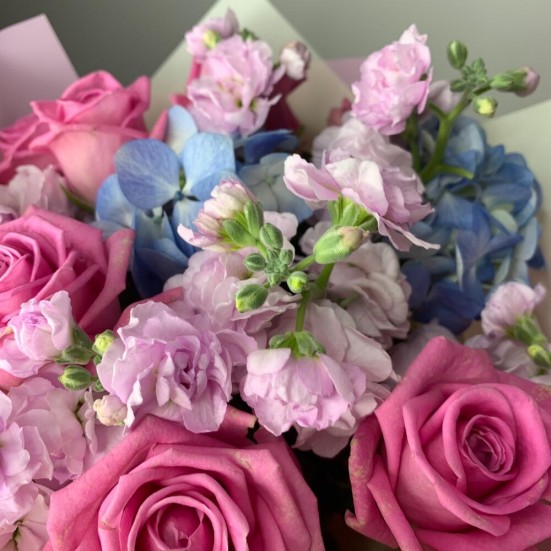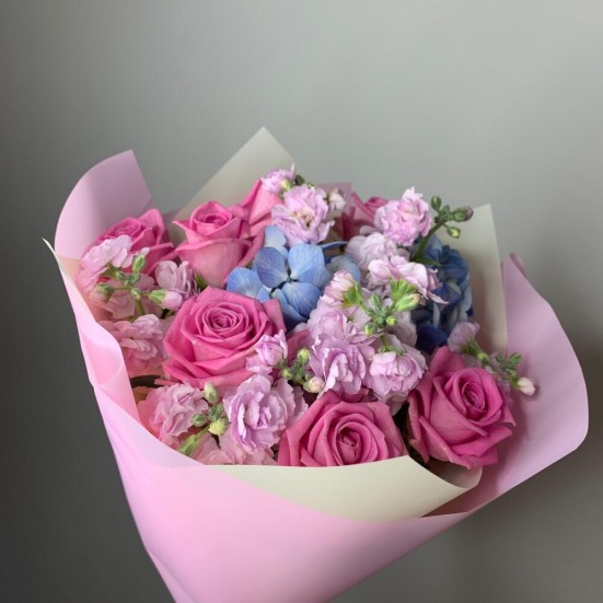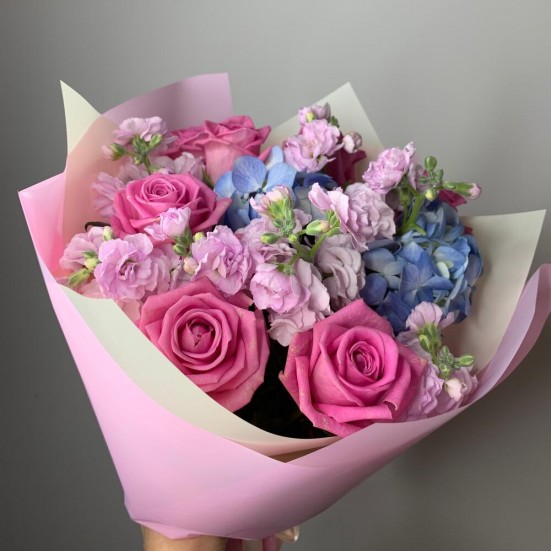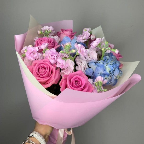 Букет с голубой гортензией и розами в Ханты-Мансийске