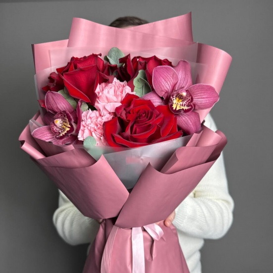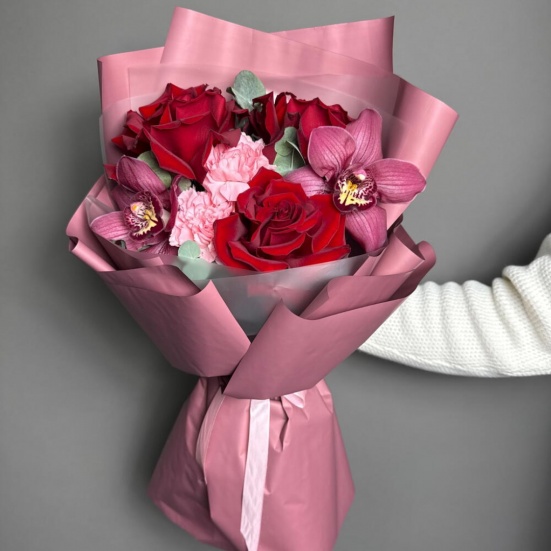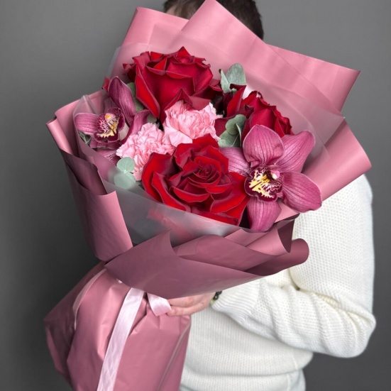 Букет из 3 красных роз, орхидей и диантуса