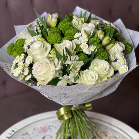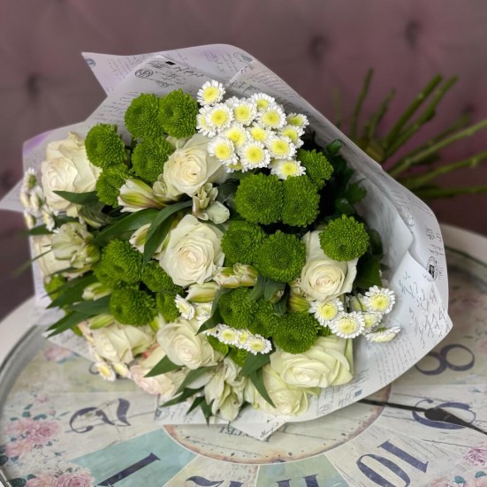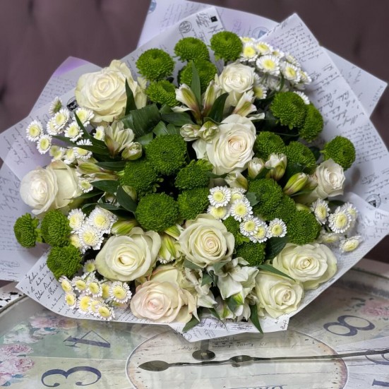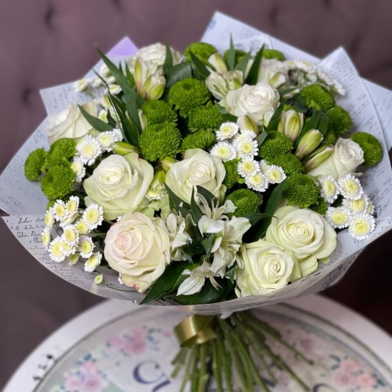 Доставили БУКЕТ ИЗ АЛЬСТРОМЕРИИ И ГВОЗДИКИ И ХРИЗАНТЕМЫ - полностью соответствует описанию и картинке. Цветы свежайшие, очень красиво выглядит! Спасибо!
