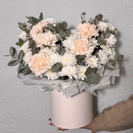 Коробка из кустовых хризантем и диантуса